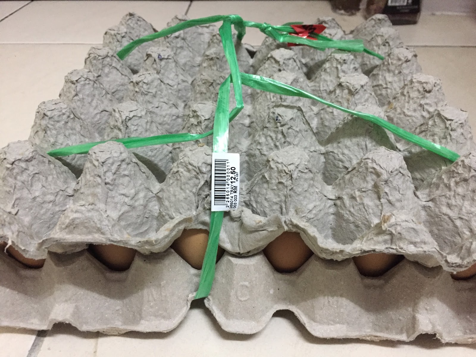 というわけで我が家も、一番安い玉子を使ってみることに。家の近くの店で探してみたところ、お店によって、または地域によって値段は数リンギットの違いはあるものの、やはり10〜13リンギット(約 455 円)くらいが相場でしょうか。