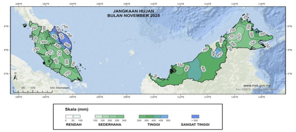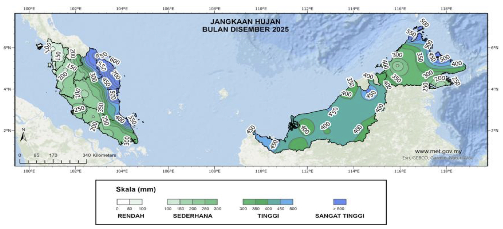 クランタン州とトレンガヌ州では降水量が400-750mmに達し、ボルネオ島の沿岸部でも最大350mmの降水量が予想されます。全国的に洪水の発生に注意が必要です。