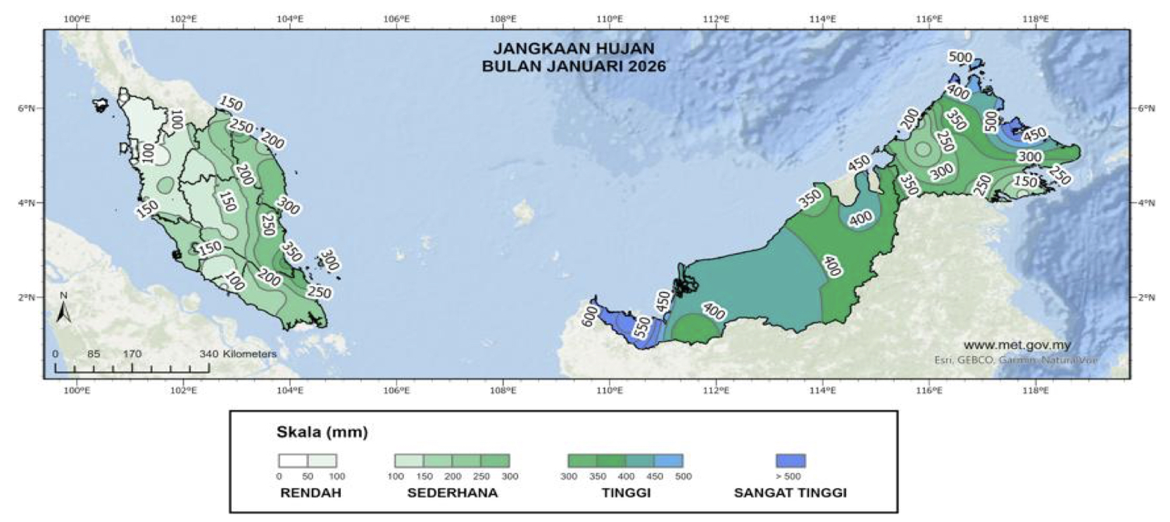 サラワク州の西部やサバ州東海岸では降水量が450-600mmと多く、ボルネオ島のそれ以外の場所では200-400mmが予想されます。
