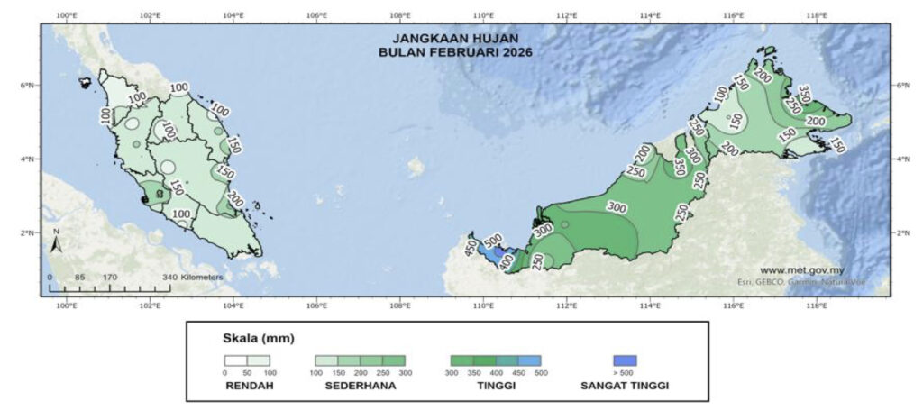 マレー半島は全体的に月間の降水量が150-200mm程度、ボルネオ島では100-400mm程度が予想されています。