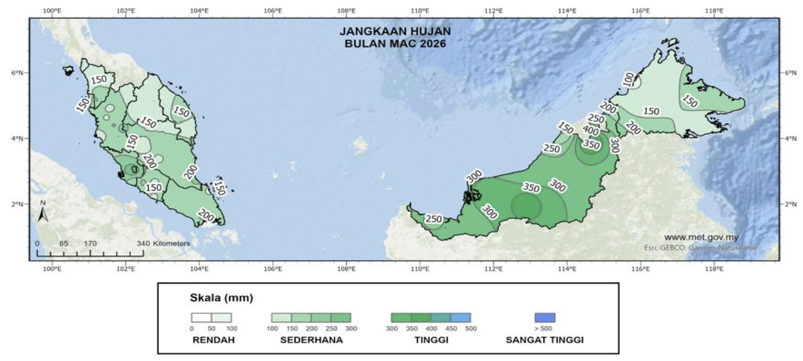 北東モンスーンの季節も終盤となり、全国的に降水量は平年並みですが、サバ州北部で例年より降水量が少し増える予想です。